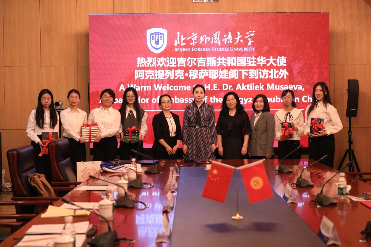 会上,吉尔吉斯语专业学生朗诵了吉尔吉斯传统诗歌,得到穆萨耶娃一行的肯定和称赞。穆萨耶娃向北外赠送了专业书籍。在北外师生的陪同下,穆萨耶娃一行随后还参观了北外吉尔吉斯斯坦中心。