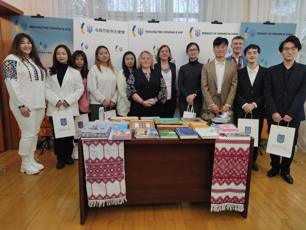 乌克兰研究中心赠书仪式。乌克兰驻华使馆临时代办、公使衔参赞张娜·列亲斯卡、一等秘书瓦列里·布隆斯基赫、二等秘书瓦莲京娜·奥利尼克出席活动。