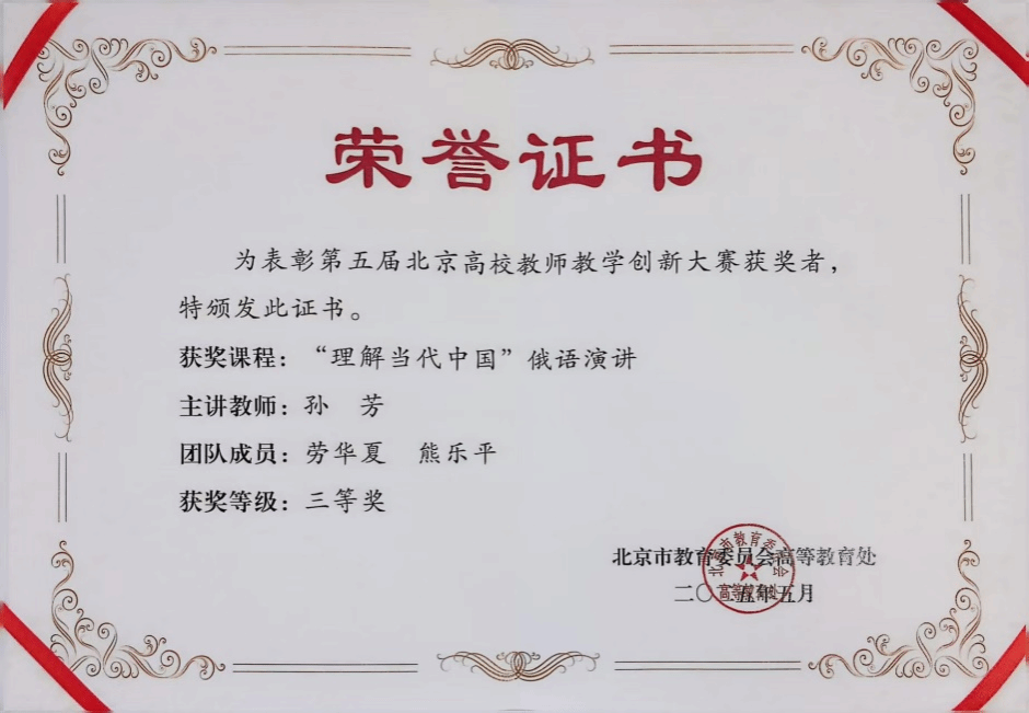 》,经严格评审,由孙芳主讲,劳华夏、熊乐平二位团队成员参与的《“理解当代中国”俄语演讲》课程获评新文科正高组三等奖,实现了学院在该项比赛上获奖等级的零突破。
